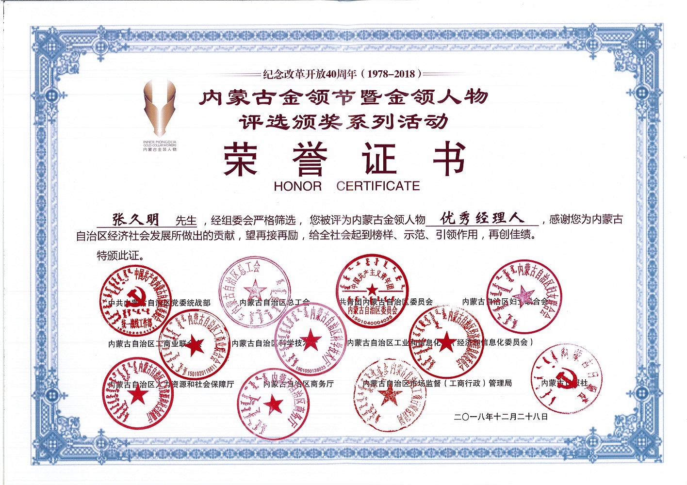 內蒙古金領節(jié)暨金領人物評選頒獎系列活動榮譽證書