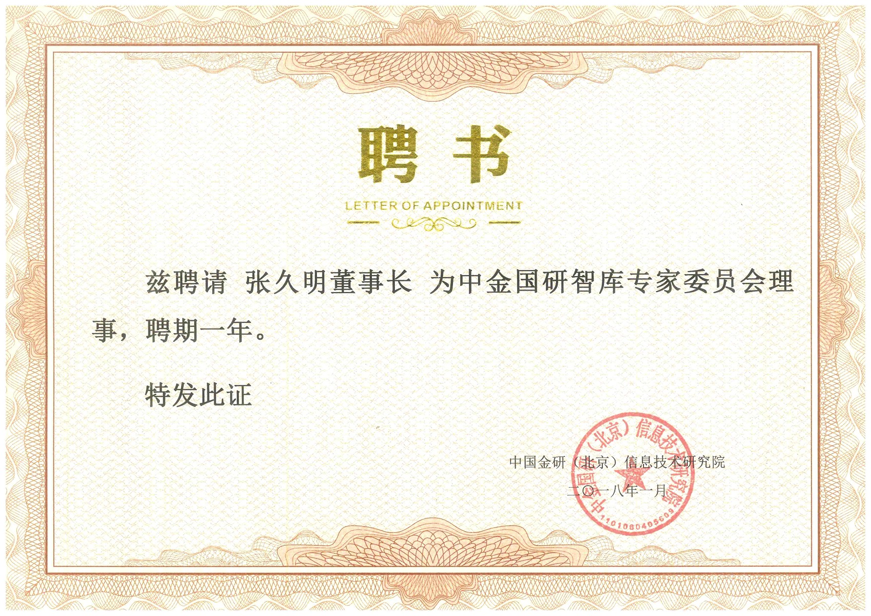 中國研智庫專家委員會理事聘書