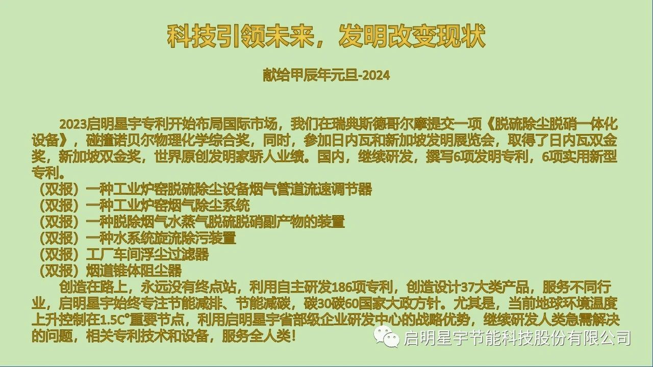 2024年,世界科技進(jìn)入新時(shí)期,啟明星宇始終專注節(jié)能減排、節(jié)能減碳,碳30碳60國(guó)家大政方針。尤其是,當(dāng)前地球環(huán)境溫度上升控制在1.5C°重要節(jié)點(diǎn),利用啟明星宇省部級(jí)企業(yè)研發(fā)中心企業(yè)的戰(zhàn)略優(yōu)勢(shì),繼續(xù)研發(fā)人類急需解決問題的專利技術(shù)和設(shè)備,服務(wù)全人類!